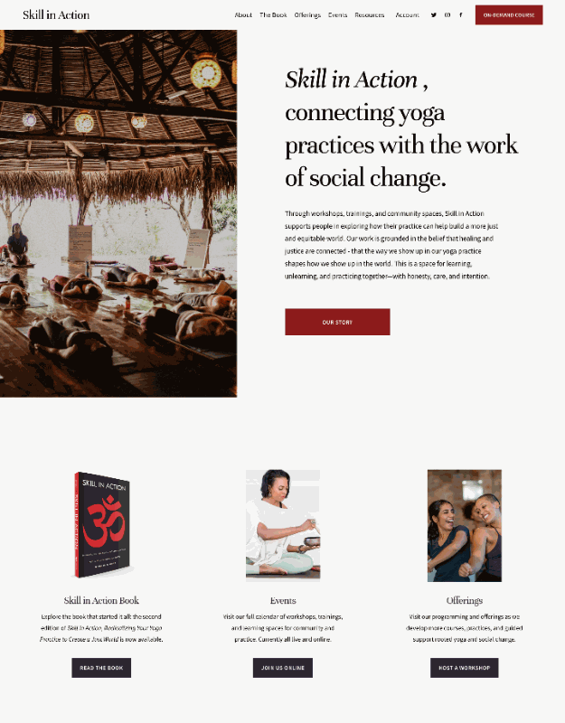 Skill in Action has been a guiding place for many people practicing yoga through the lens of justice. Over the years the site expanded from the book to holding more and more offerings, teachings, and resources. It was time for it to breathe again. So, with the addition of the new on-demand course as well a growing team of facilitators, the site was re-designed to feel clear, steady, and reflective of where the work is now.